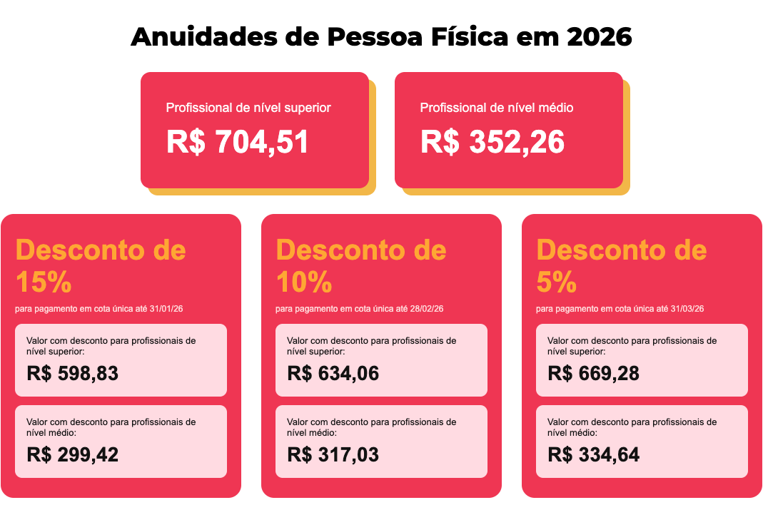 Mas atenção: O boleto da anuidade será emitido com o vencimento em 31/03/2026 e já incluirá o desconto de 5% para cota única referente ao período de março. No entanto, se o pagamento for realizado em janeiro, será aplicado automaticamente um desconto total de 15% sobre o valor integral da anuidade, e, se em fevereiro, o desconto será de 10% sobre o valor integral da anuidade.